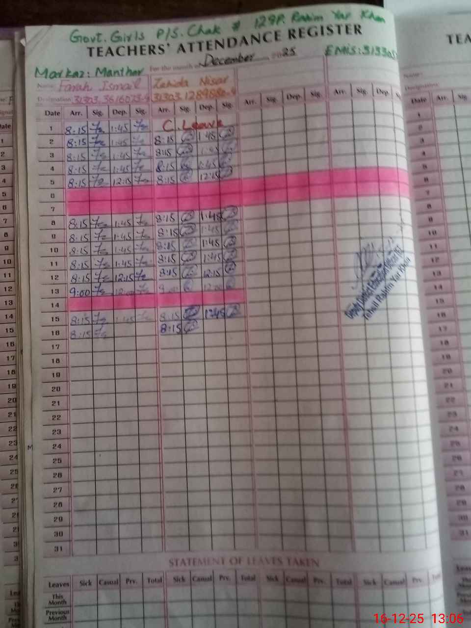 | CNIC | Full Name | Designation | R/C | Absence During Last Calender Month |