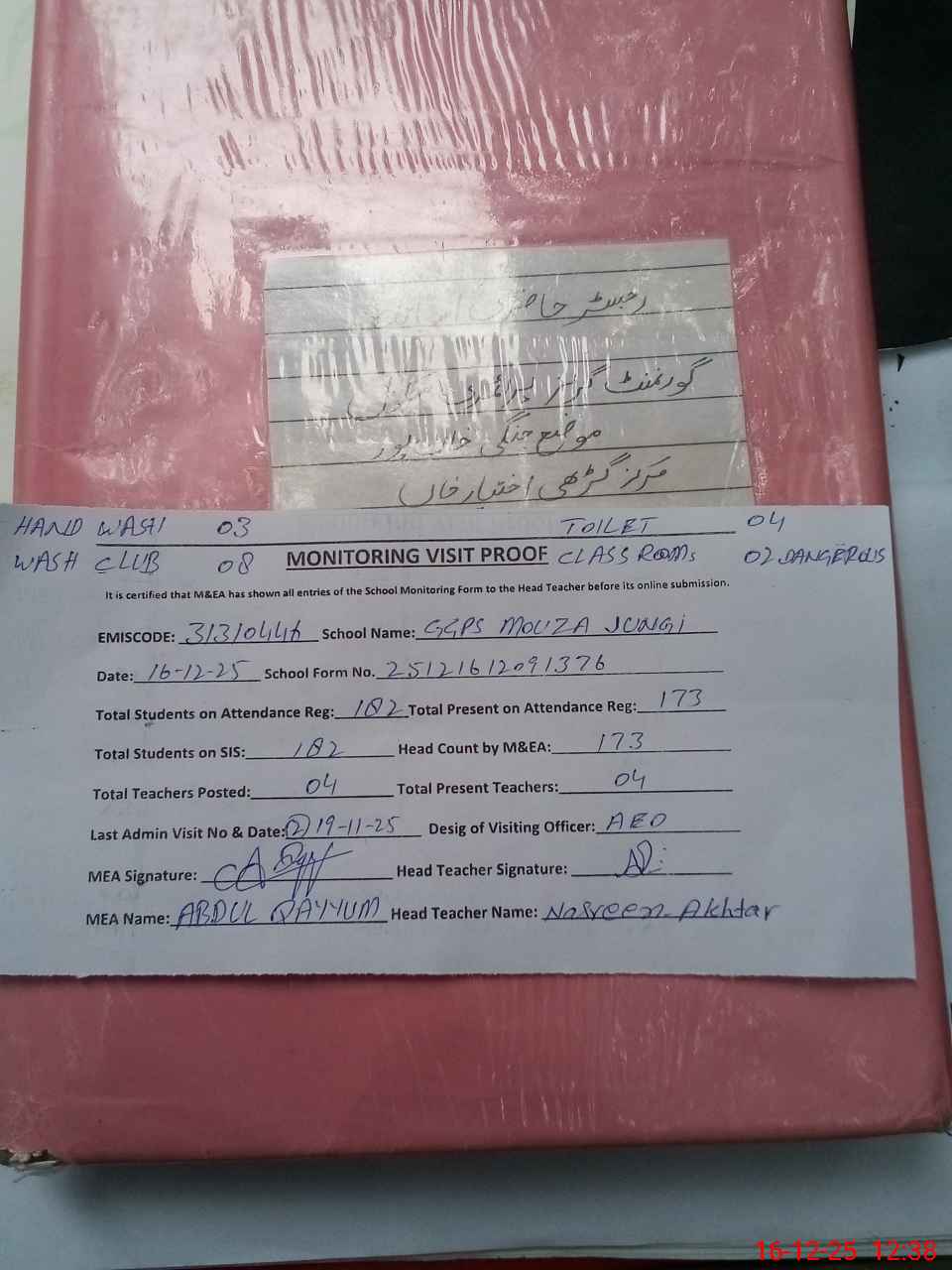 | Attendance Register | Head Teacher | MEA with School | Visit Proof |