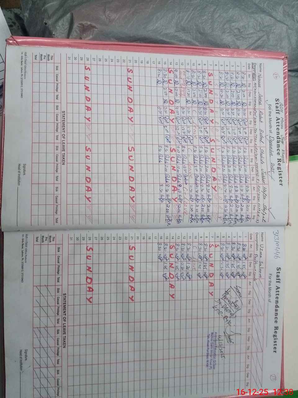 | CNIC | Full Name | Designation | R/C | Absence During Last Calender Month |