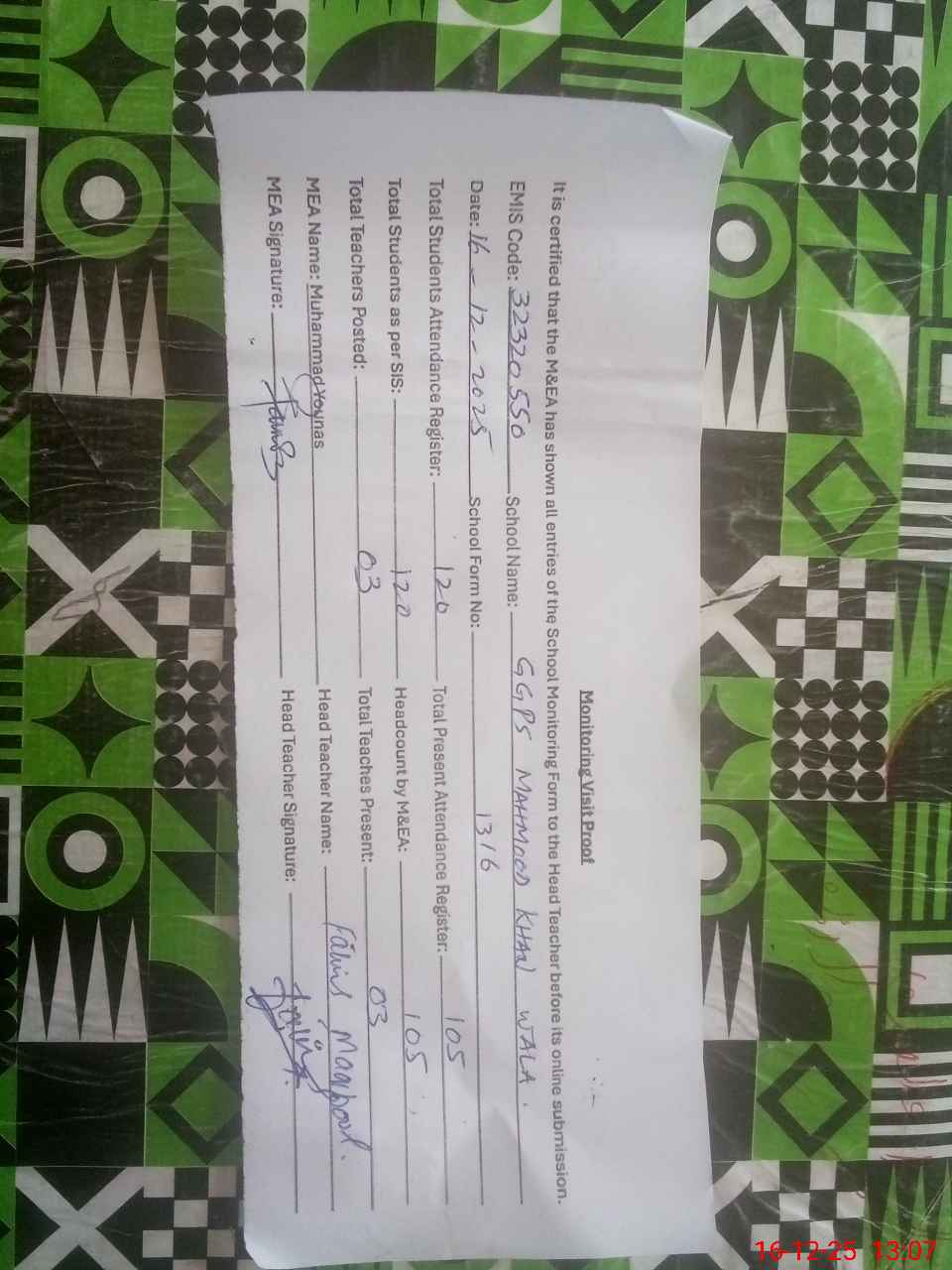 | EMIS Code: 32320550 | Name of School: GGPS MAHMOOD KHAN WALA | |||