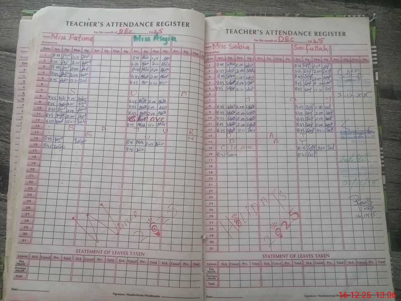 | Attendance Register | Head Teacher | MEA with School | Visit Proof |