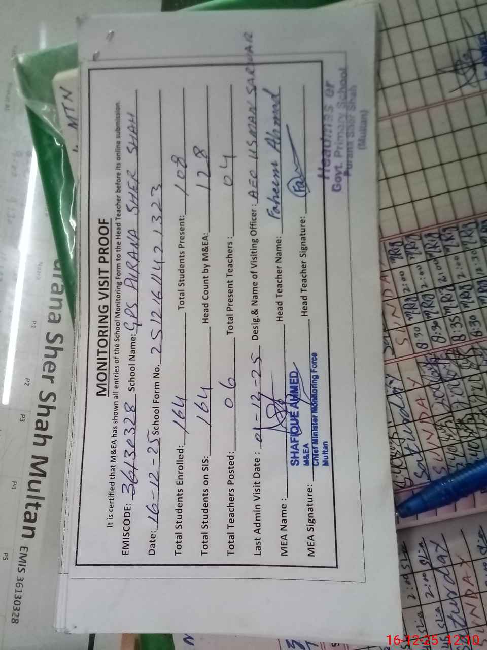 | Attendance Register | Head Teacher | MEA with School | Visit Proof |