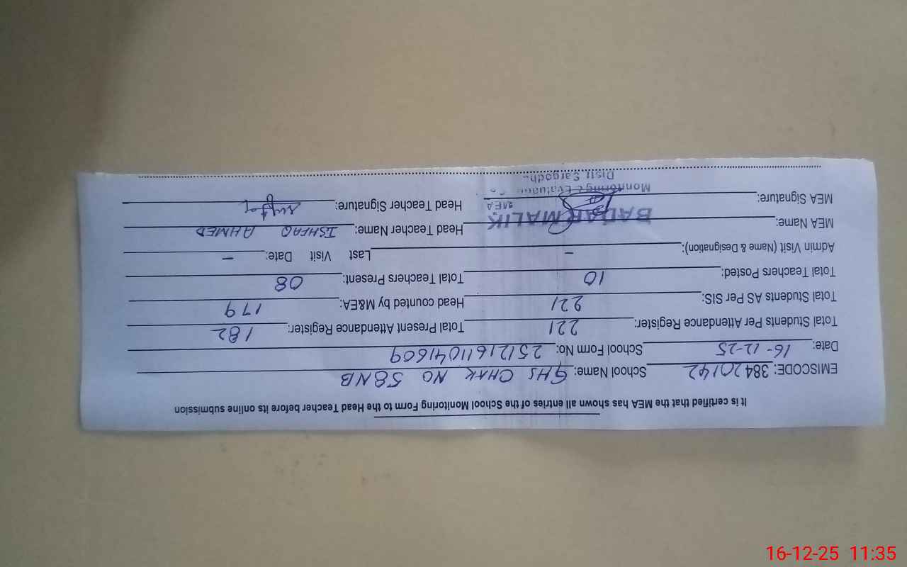 | Attendance Register | Head Teacher | MEA with School | Visit Proof |