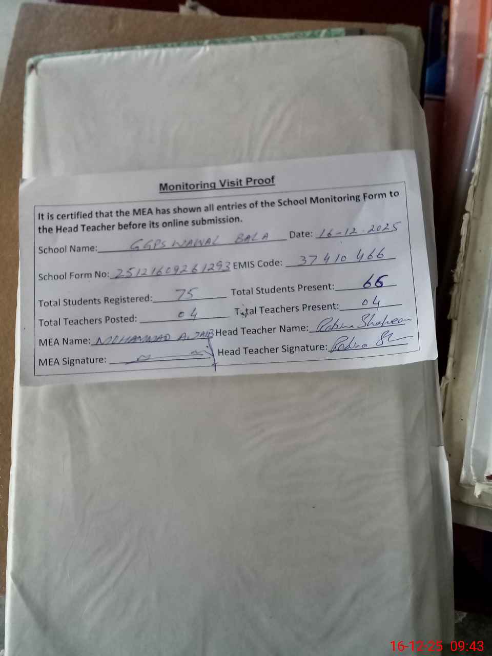 | Attendance Register | Head Teacher | MEA with School | Visit Proof |