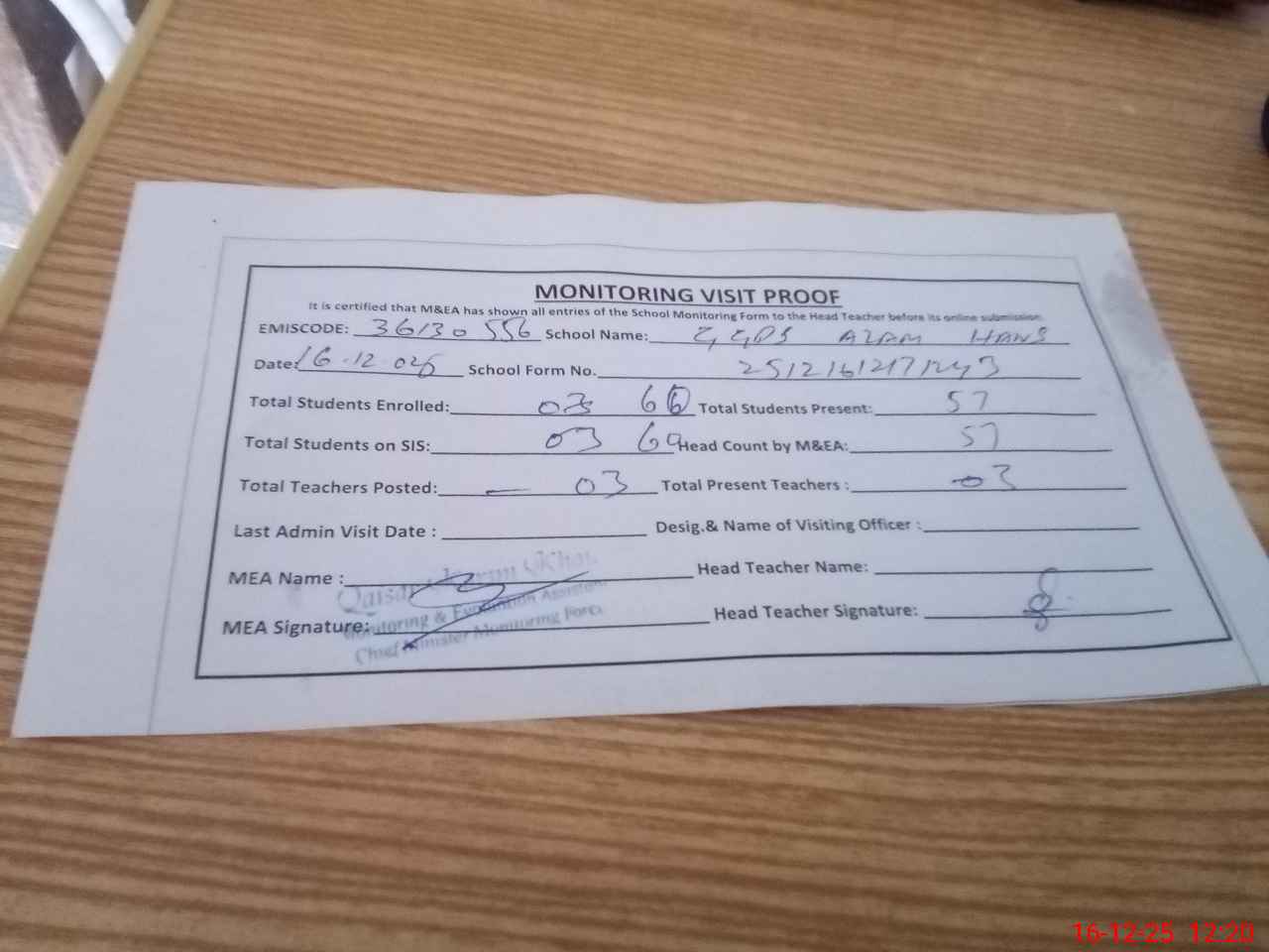 | Attendance Register | Head Teacher | MEA with School | Visit Proof |