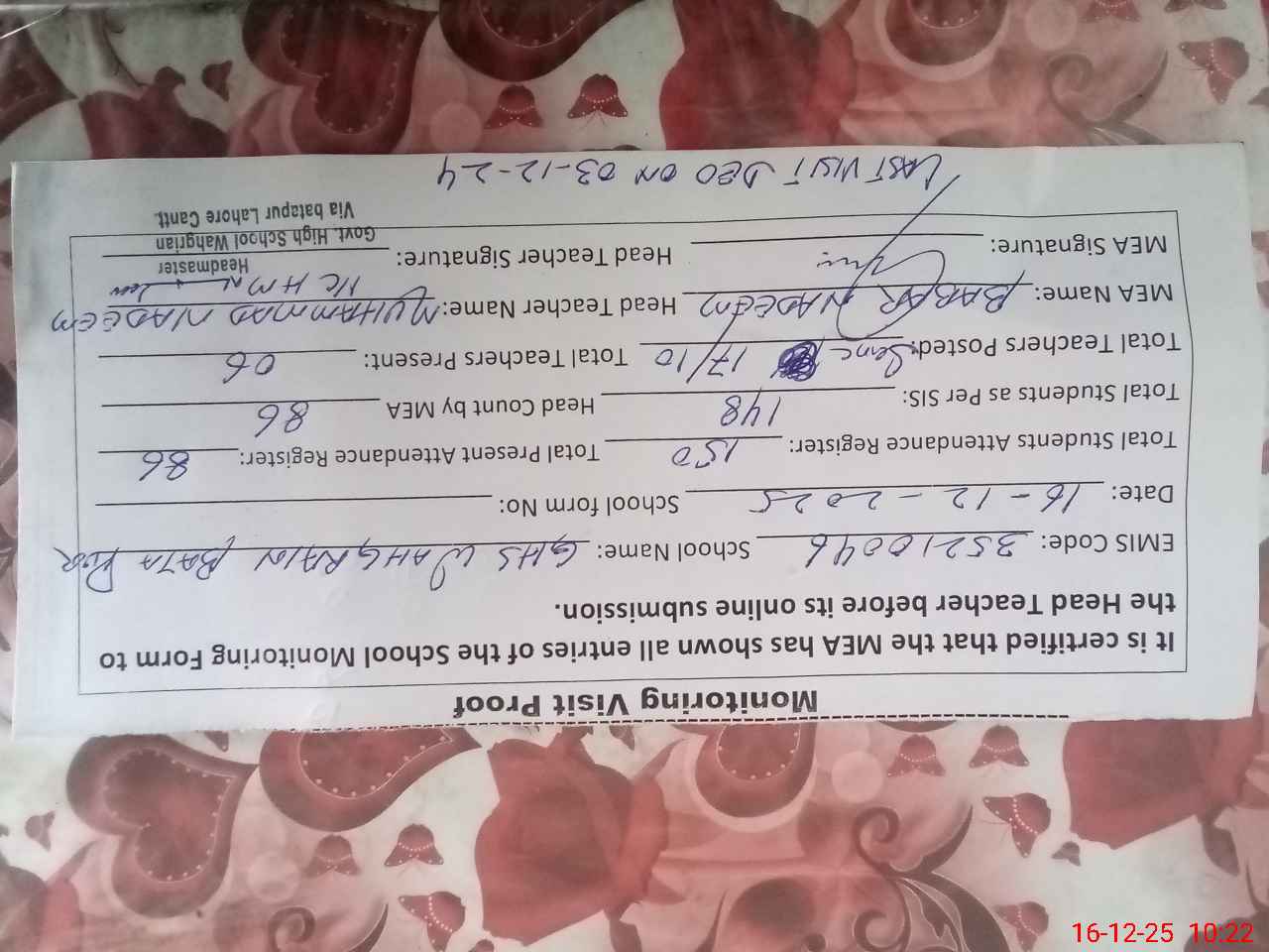| Certified that this School was Inspected by the Undersigned MEA/DMO Today and the Information Stated Above is as Per Record. | |||||