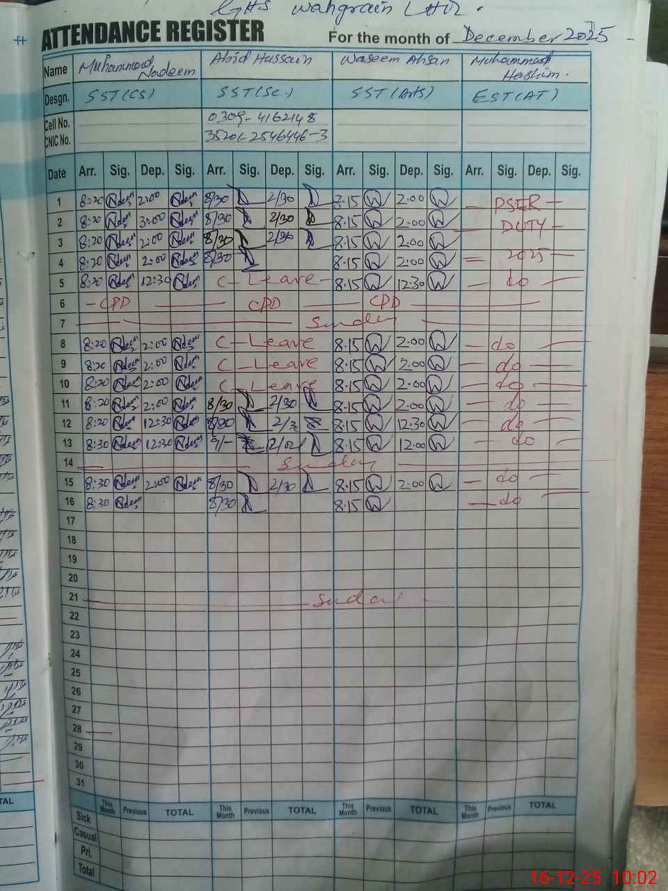 | CNIC | Full Name | Designation | R/C | Absence during last cal. month |
