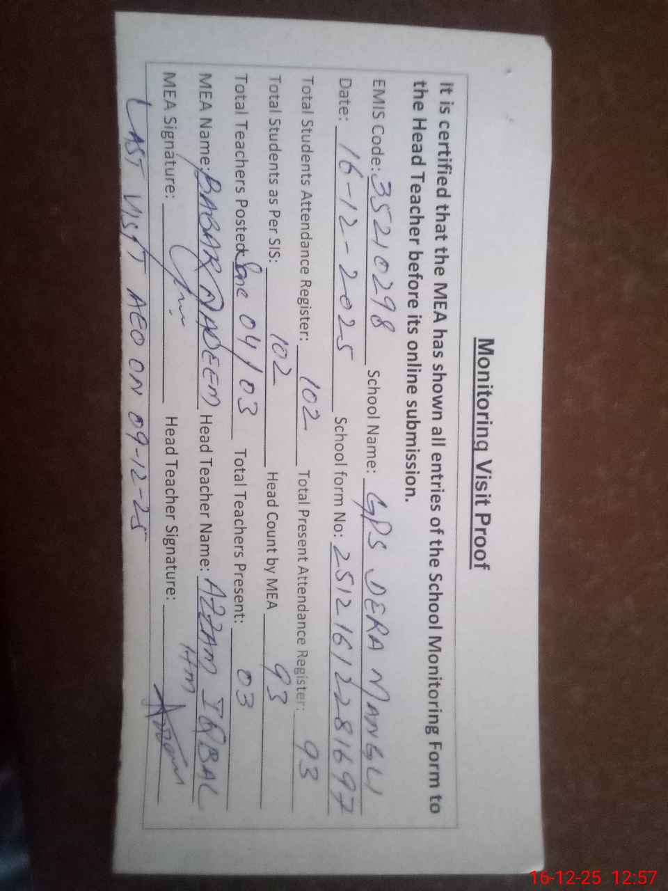 | Attendance Register | Head Teacher | MEA with School | Visit Proof |
