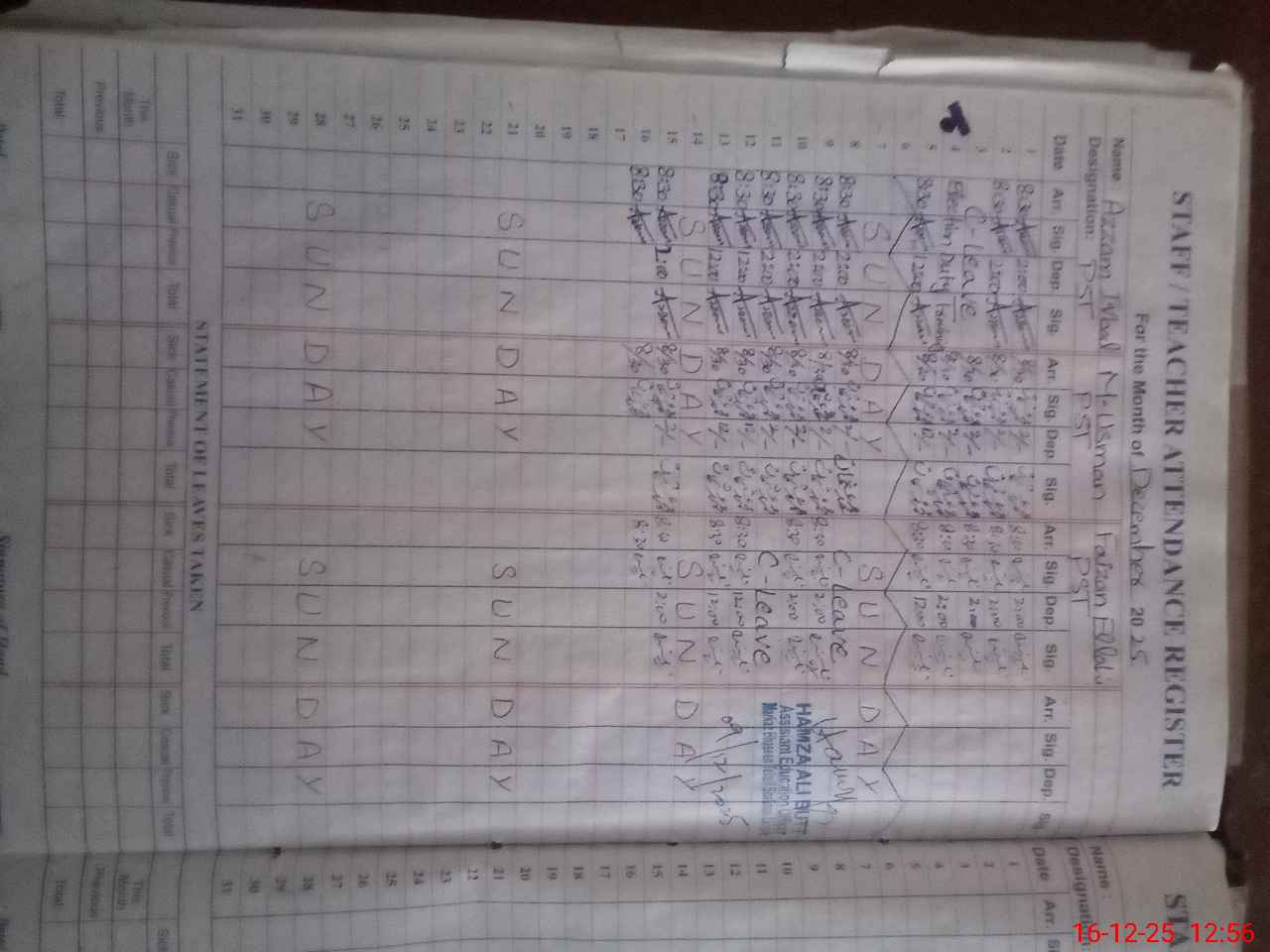| CNIC | Full Name | Designation | R/C | Absence During Last Calender Month |