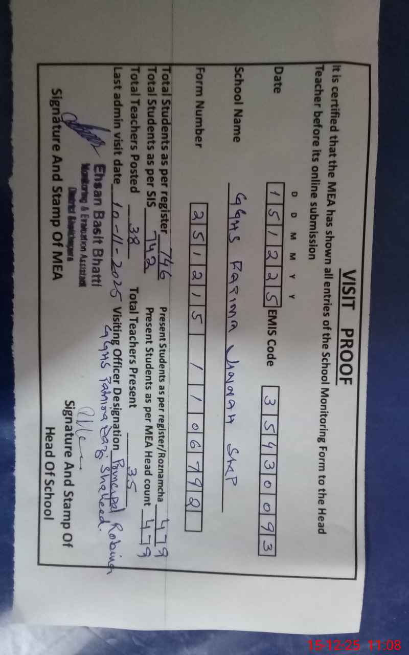 | EMIS Code: 35430093 | Name of School: GGHS FATIMA JINNAH SHEIKHUPURA | |||