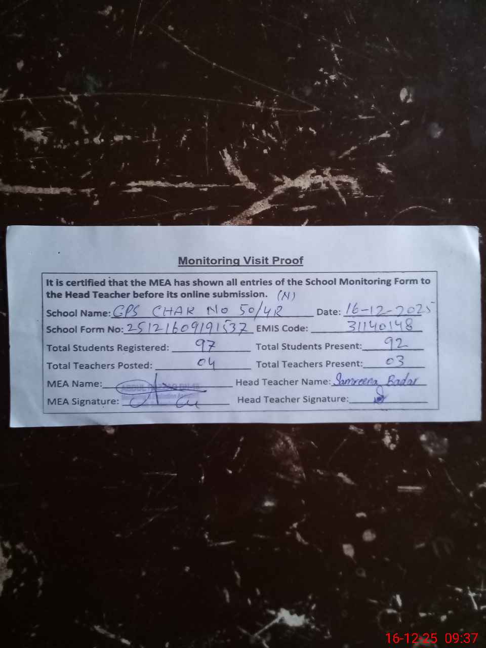 | Attendance Register | Head Teacher | MEA with School | Visit Proof |