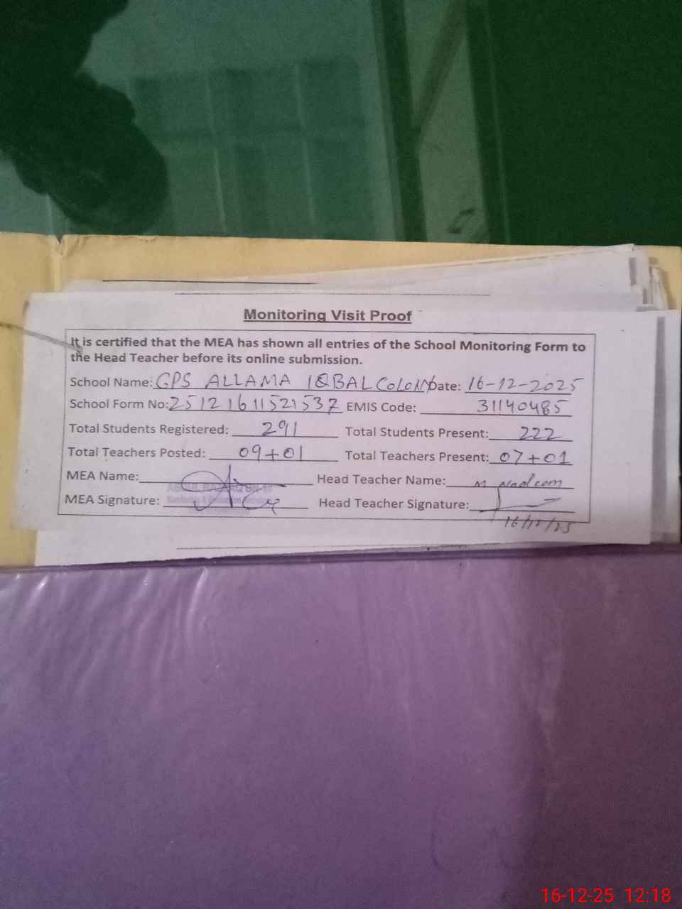 | EMIS Code: 31140485 | Name of School: GPS ALLAMA IQBAL COLONY | |||