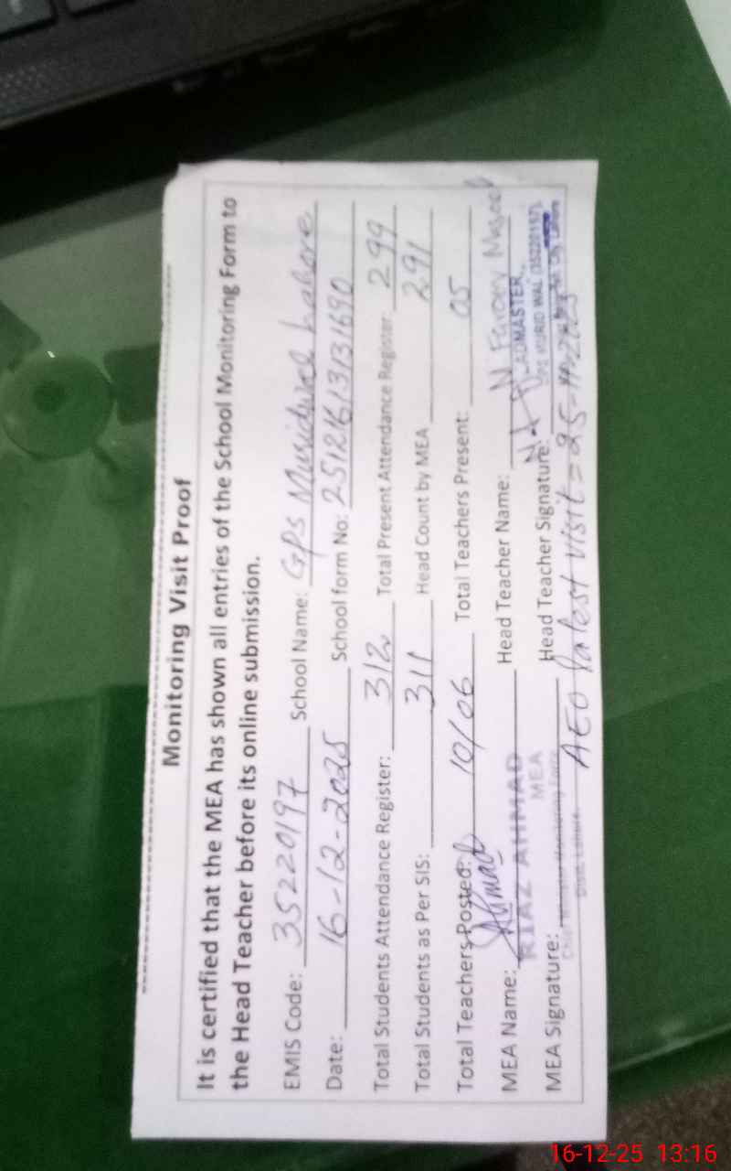 | EMIS Code: 35220197 | Name of School: GPS MURIDWALI | |||