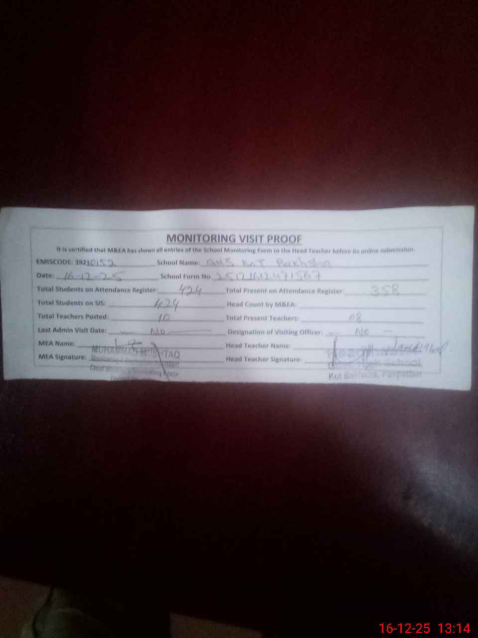 | Attendance Register | Head Teacher | MEA with School | Visit Proof |
