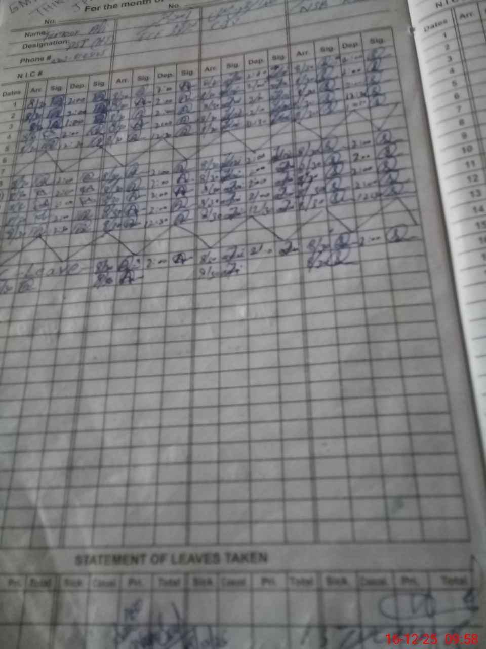 | CNIC | Full Name | Designation | R/C | Absence During Last Calender Month |