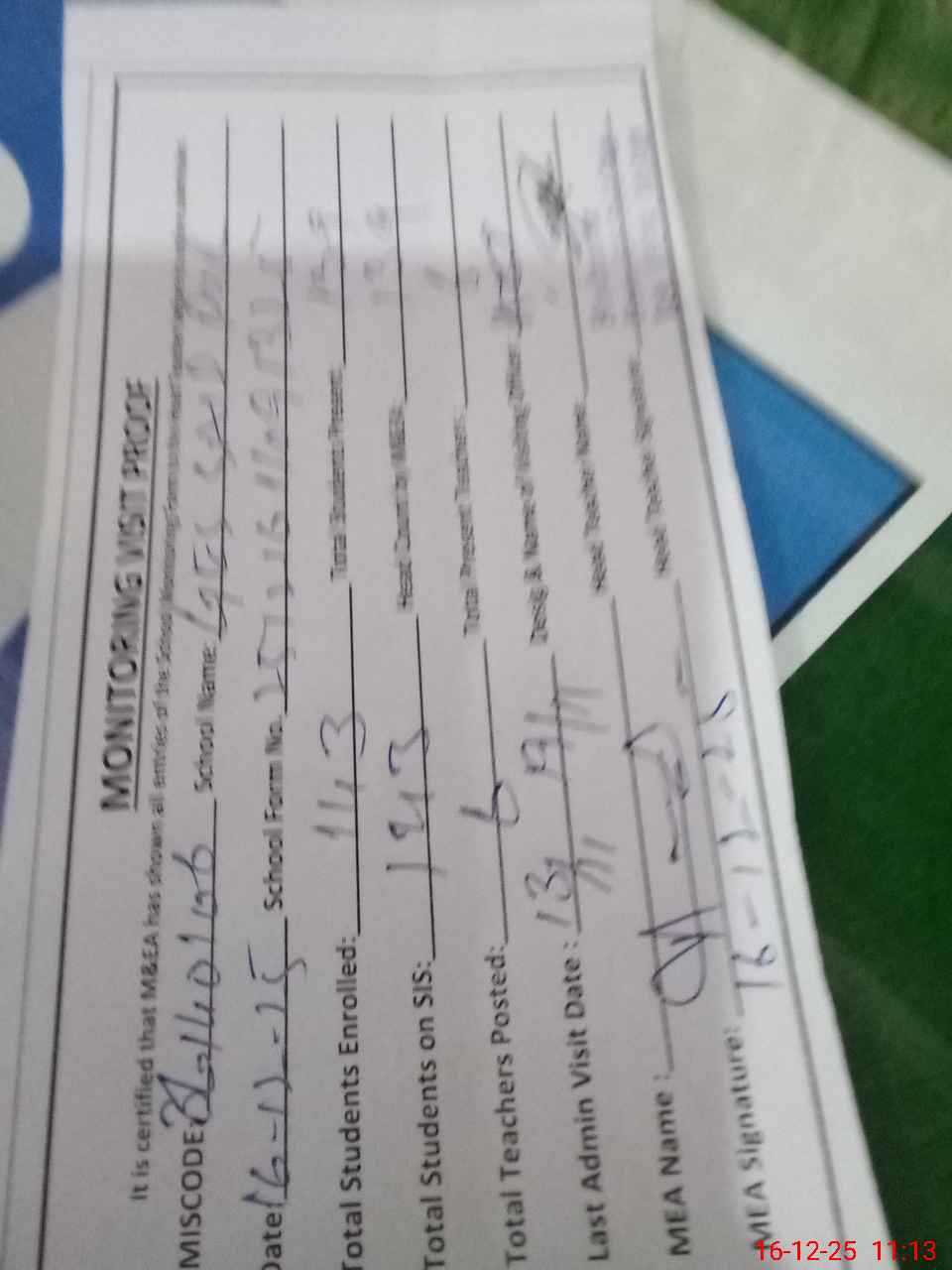 | Attendance Register | Head Teacher | MEA with School | Visit Proof |