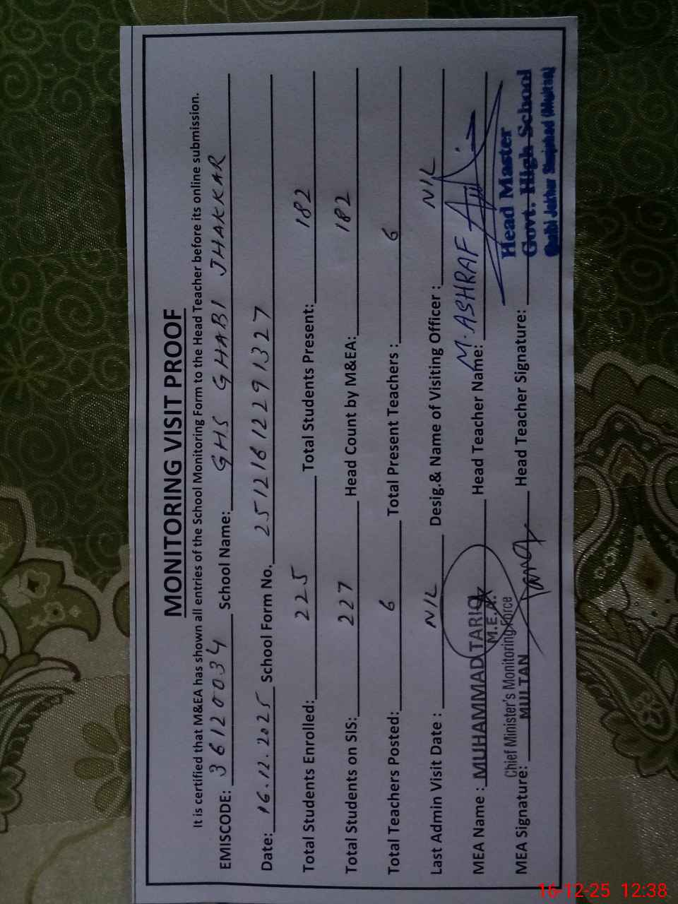 | EMIS Code: 36120034 | Name of School: GHS GHABI JHAKKAR SHUJABAD | |||