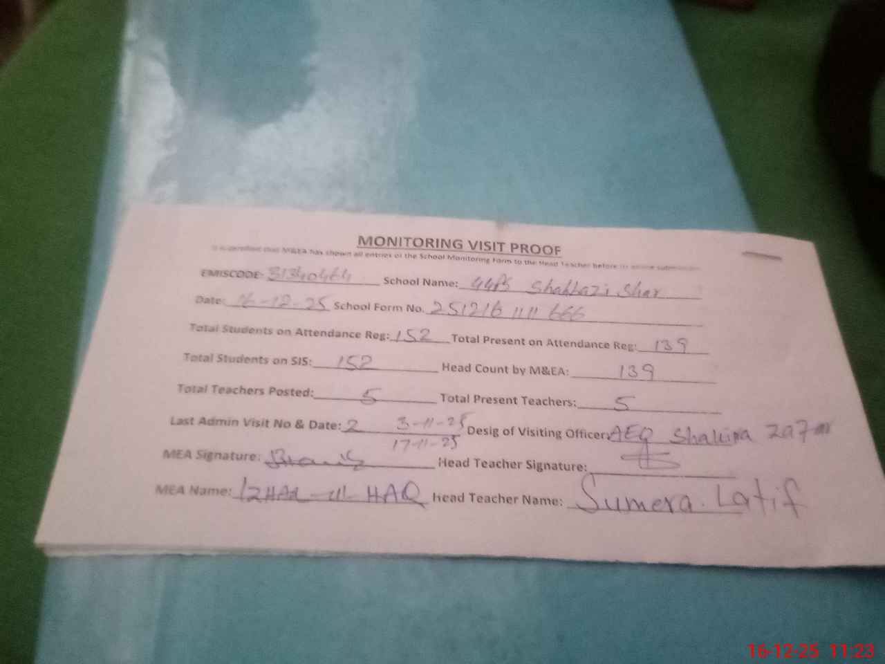 | Attendance Register | Head Teacher | MEA with School | Visit Proof |