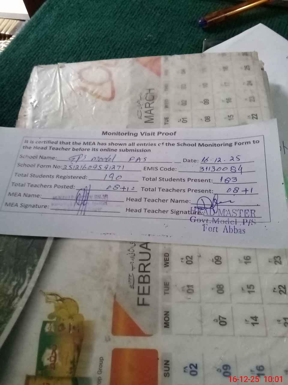 | Attendance Register | Head Teacher | MEA with School | Visit Proof |