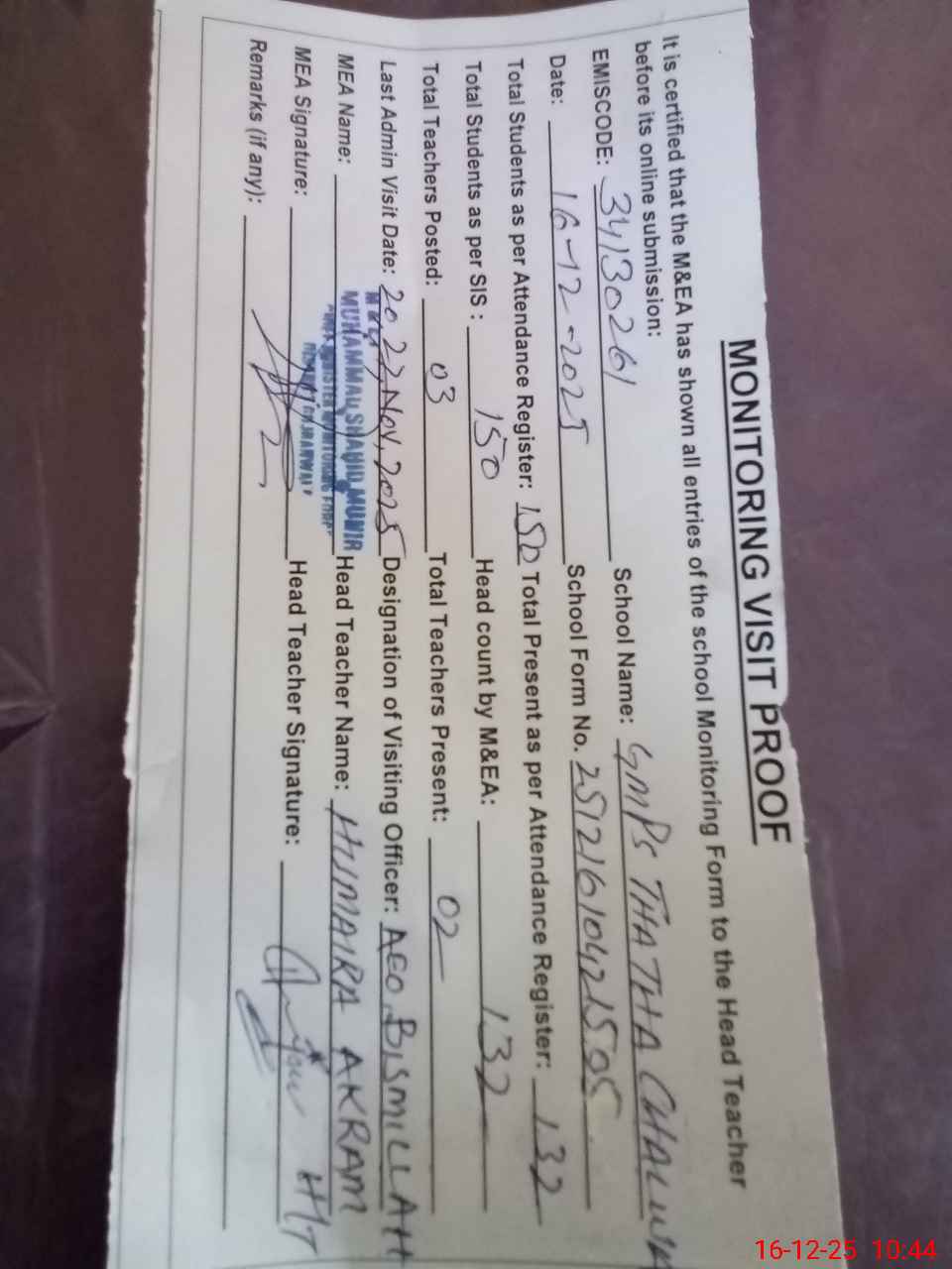| Monitoring Date: 16-12-2025 | Start Time: 16-12-2025 10:21 AM | End Time: 16-12-2025 10:44 AM | Name of MEA: S-**** Sh**** Mu**** | |