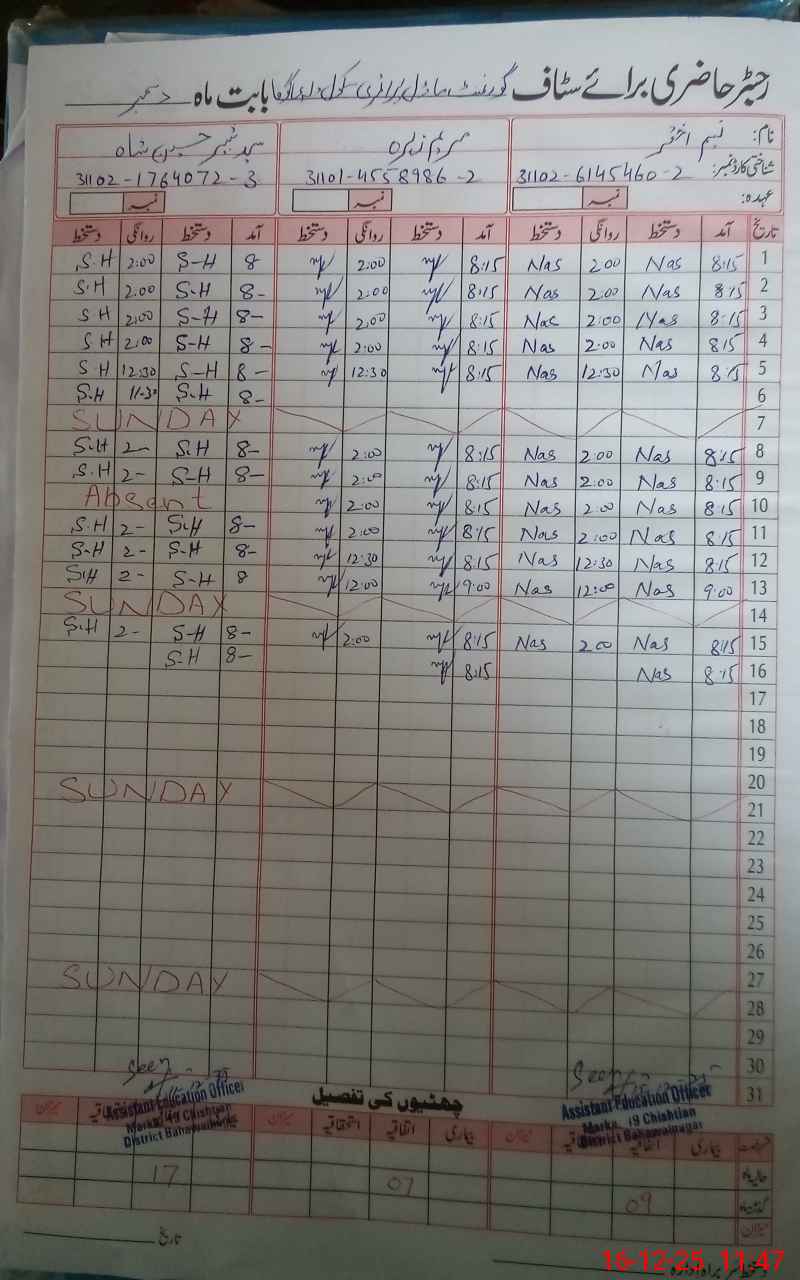 | CNIC | Full Name | Designation | R/C | Absence During Last Calender Month |