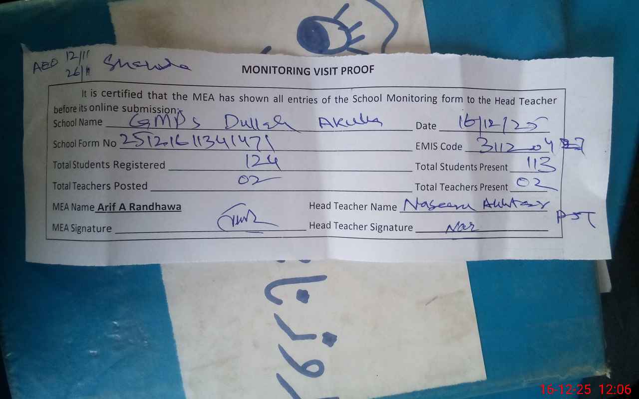 | Attendance Register | Head Teacher | MEA with School | Visit Proof |