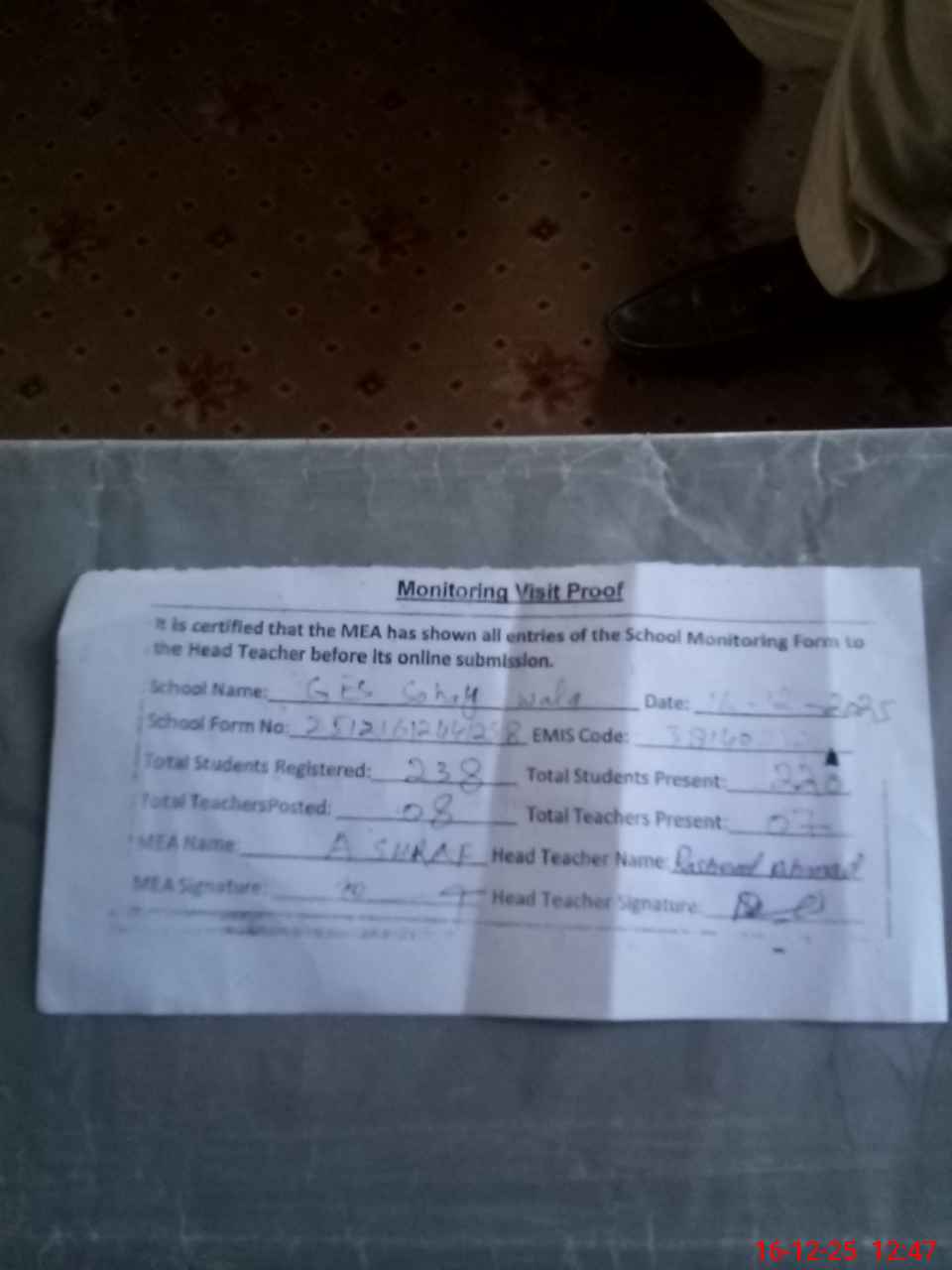| Attendance Register | Head Teacher | MEA with School | Visit Proof |