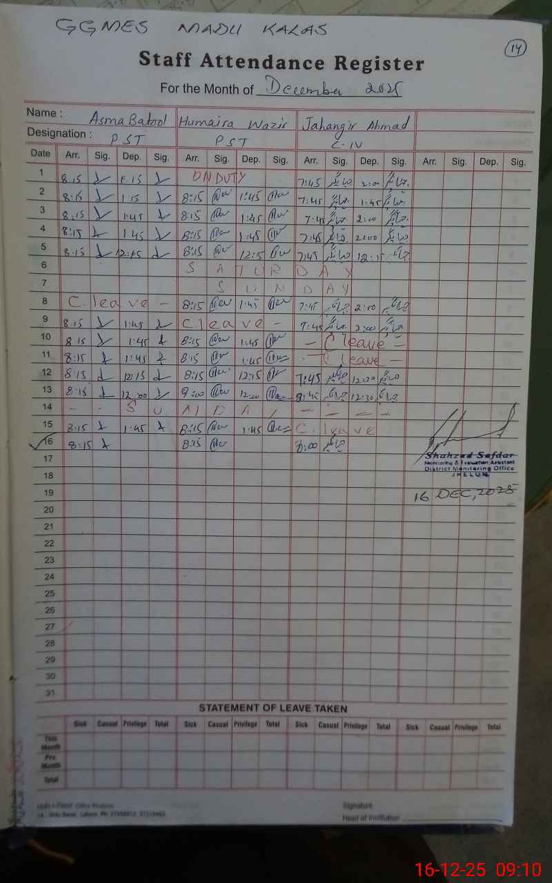 | District: JHELUM | Tehsil: DINA | Markaz: MADU KALAS - FEMALE | Level: Middle | |