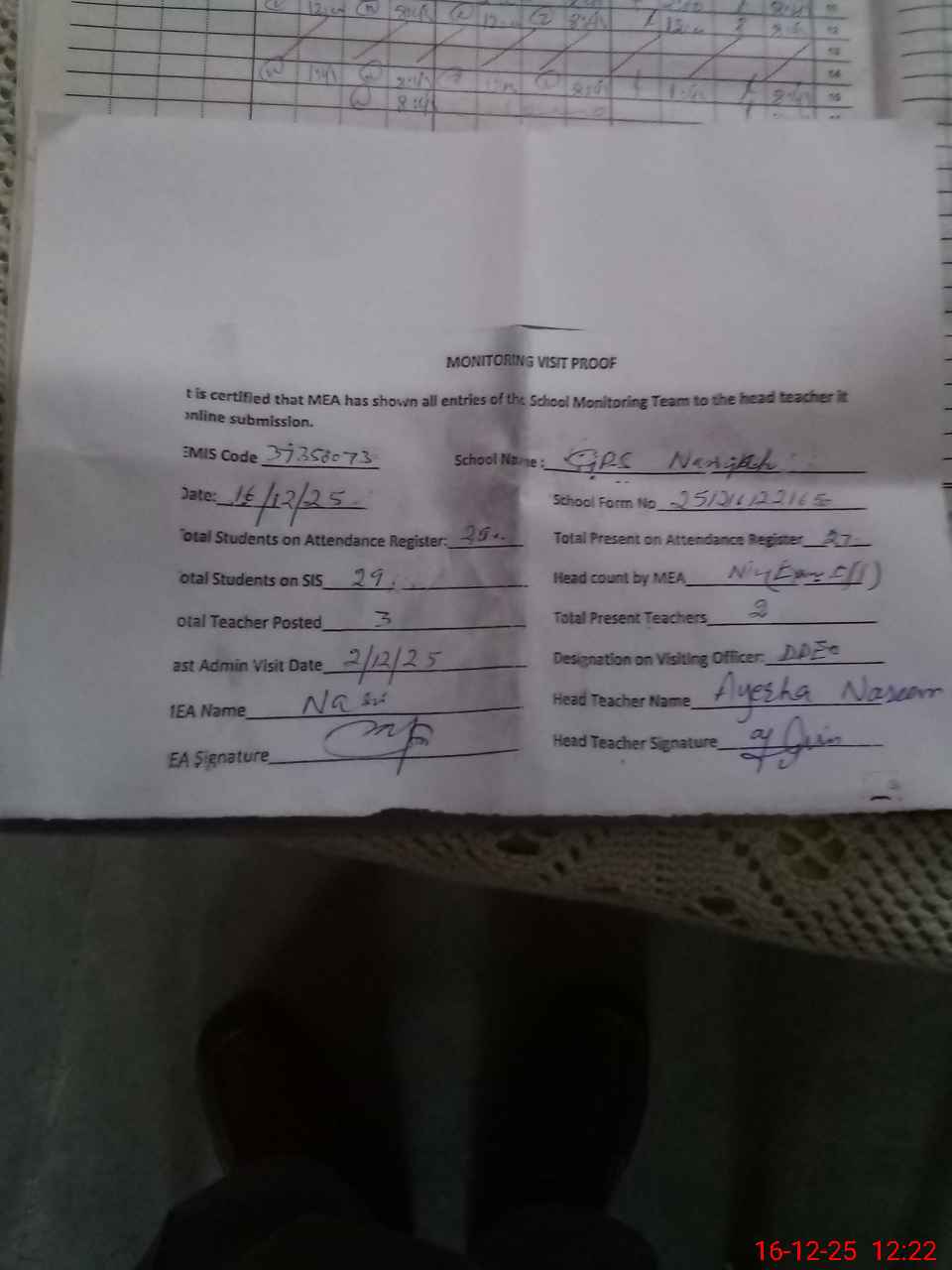 | Attendance Register | Head Teacher | MEA with School | Visit Proof |