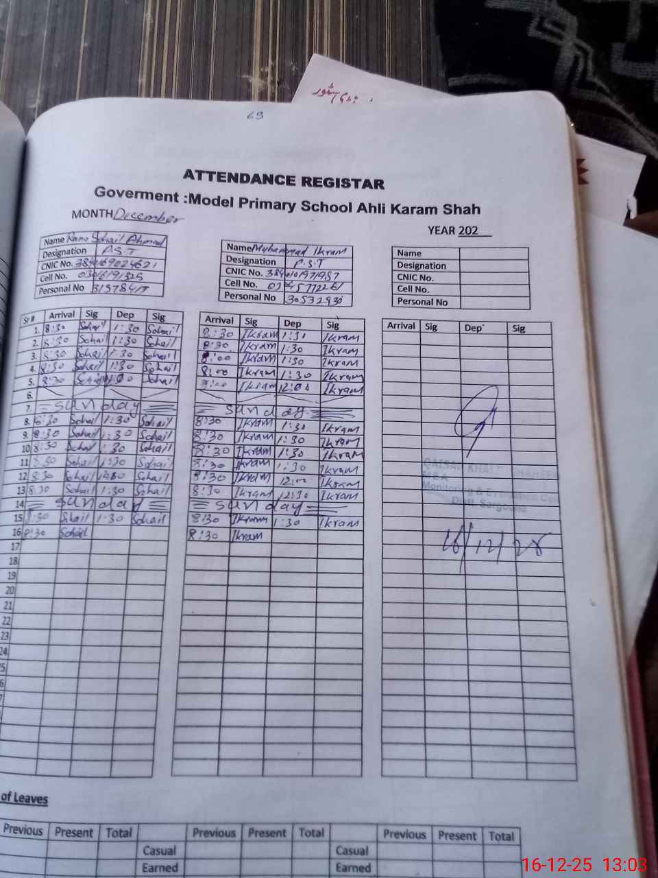 | CNIC | Full Name | Designation | R/C | Absence during last cal. month |