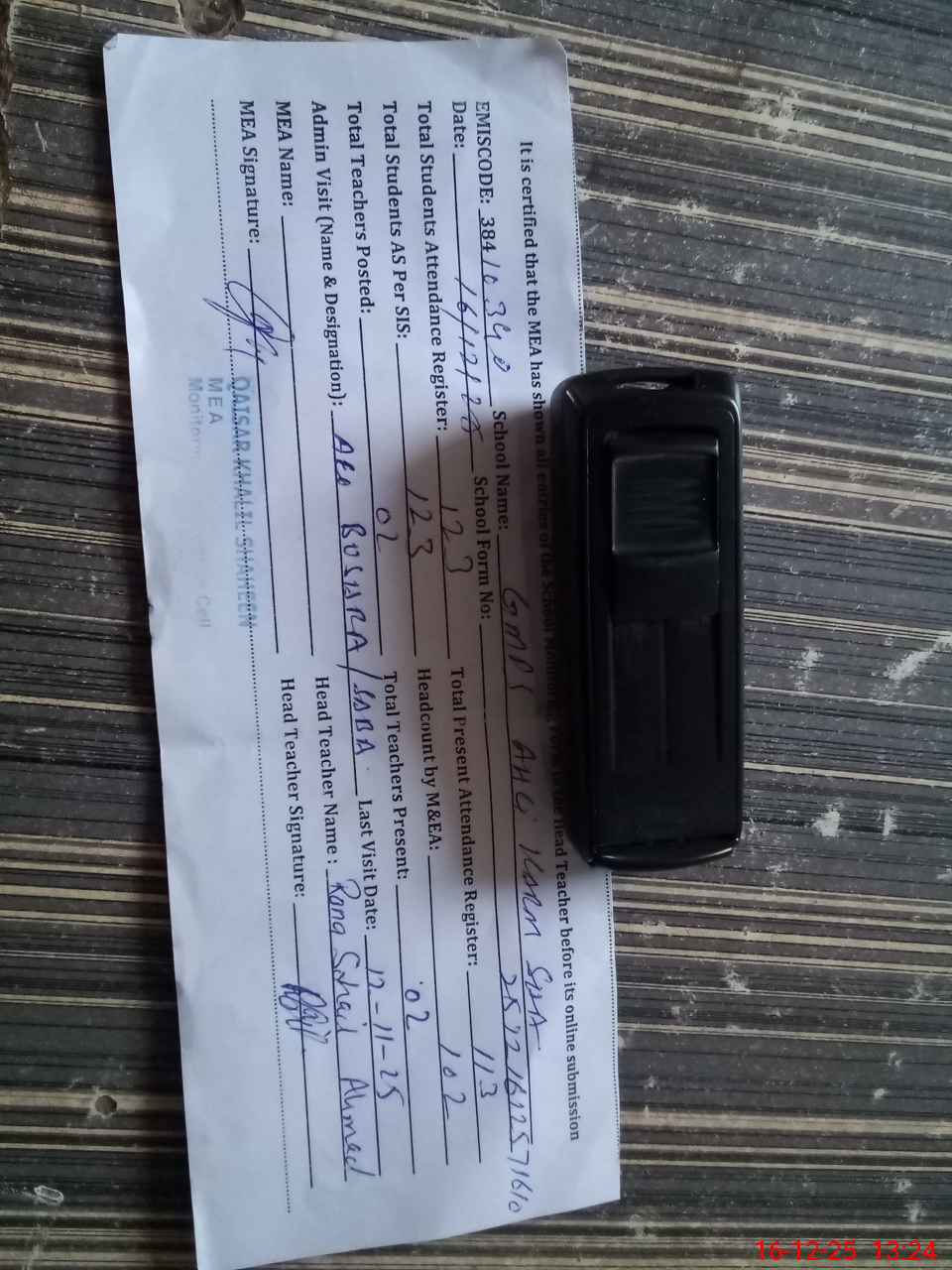 | Attendance Register | Head Teacher | MEA with School | Visit Proof |