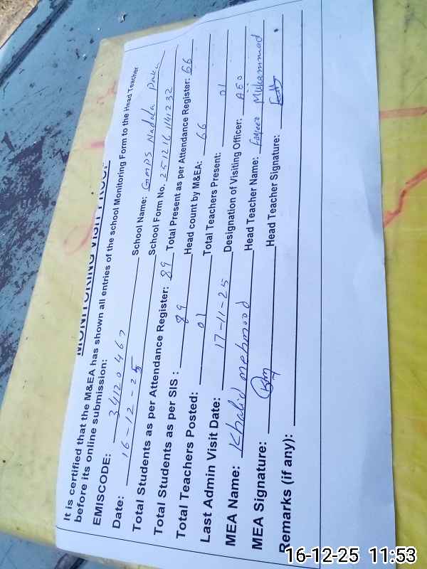 | Attendance Register | Head Teacher | MEA with School | Visit Proof |