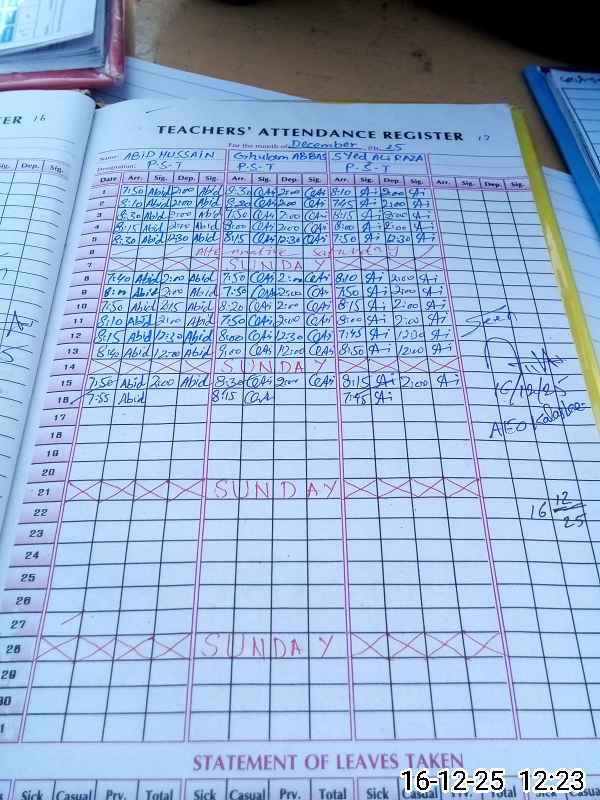| CNIC | Full Name | Designation | R/C | Absence During Last Calender Month |