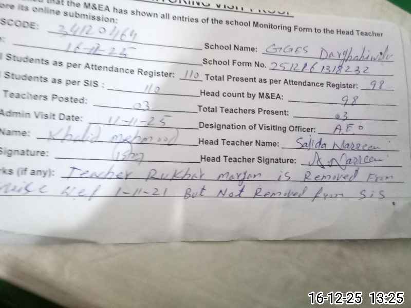 | Remarks (Use Separate Page if Required): teacher rukhsar Maryam sese maths removed from service. w e f 1st Nov 2021 but not removed from sis. | |||||