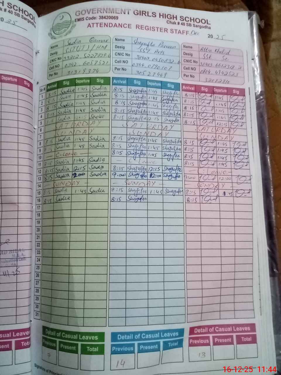 | CNIC | Full Name | Designation | R/C | Absence during last cal. month |