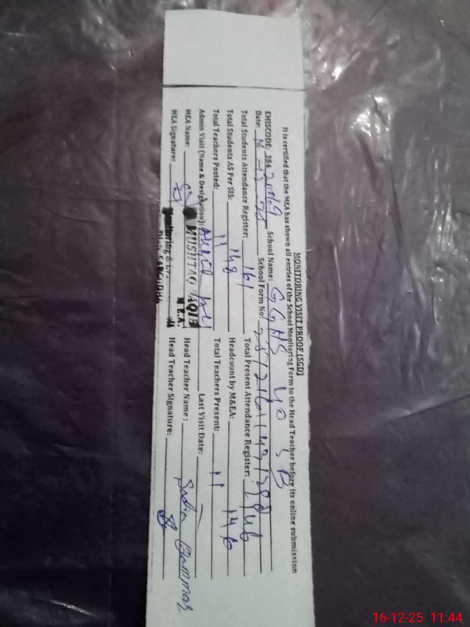 | Attendance Register | Head Teacher | MEA with School | Visit Proof |