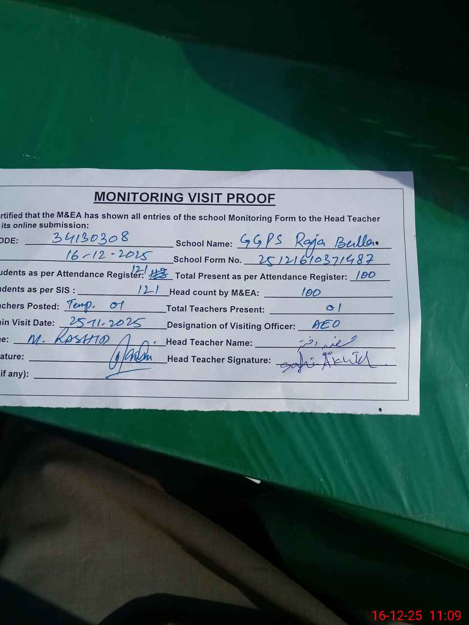 | Attendance Register | Head Teacher | MEA with School | Visit Proof |