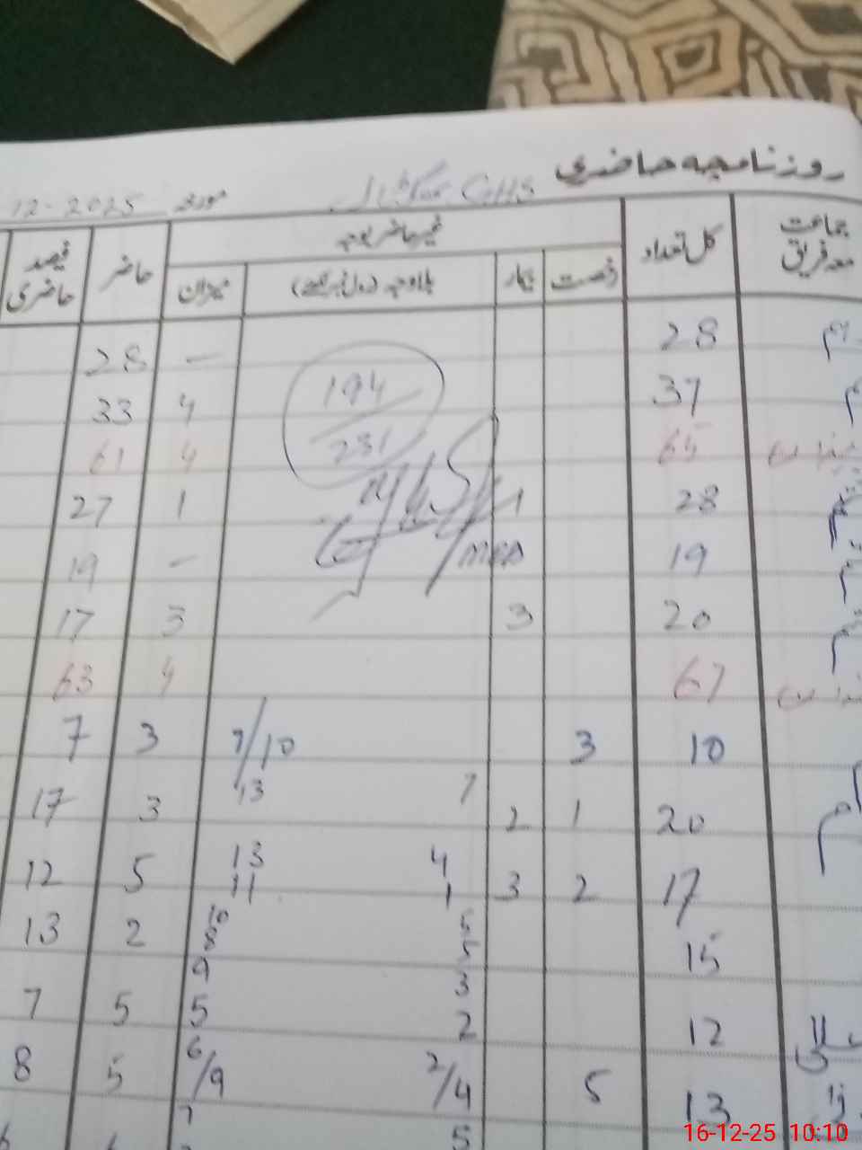 | CNIC | Full Name | Designation | R/C | Absence during last cal. month |