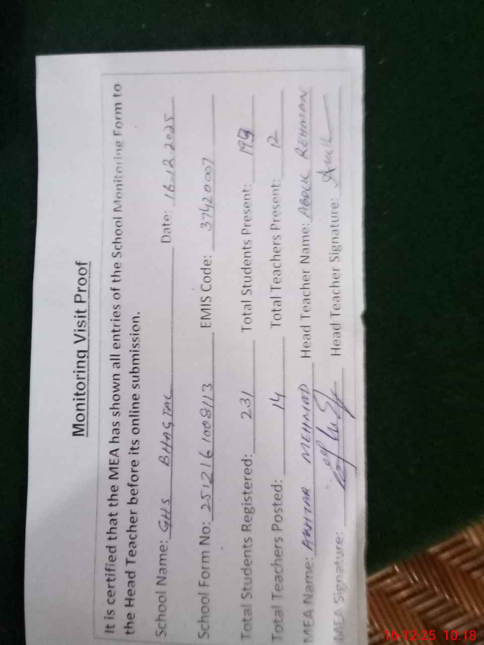 | Attendance Register | Head Teacher | MEA with School | Visit Proof |
