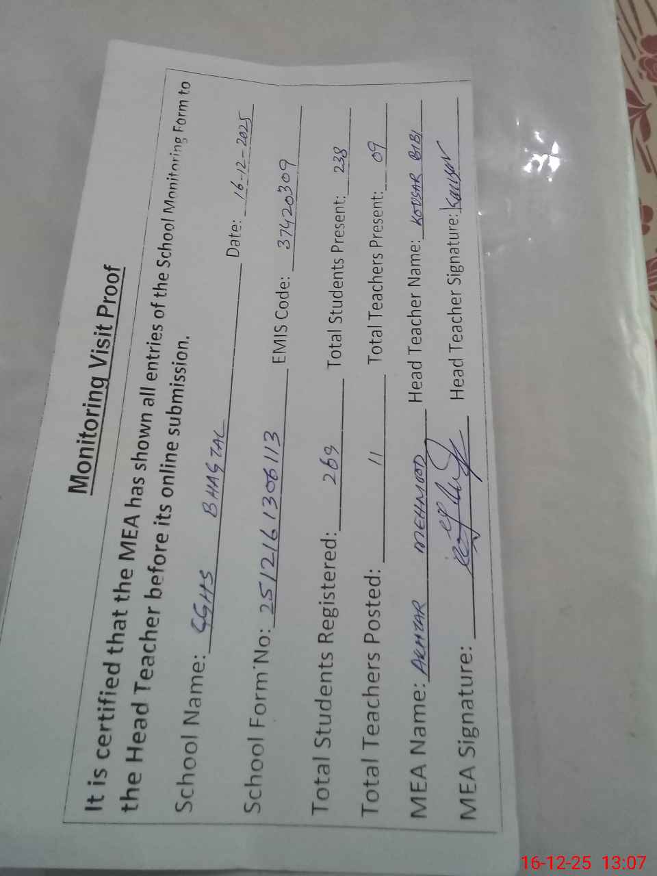 | EMIS Code: 37420309 | Name of School: GGHS BHAGTHAL | |||