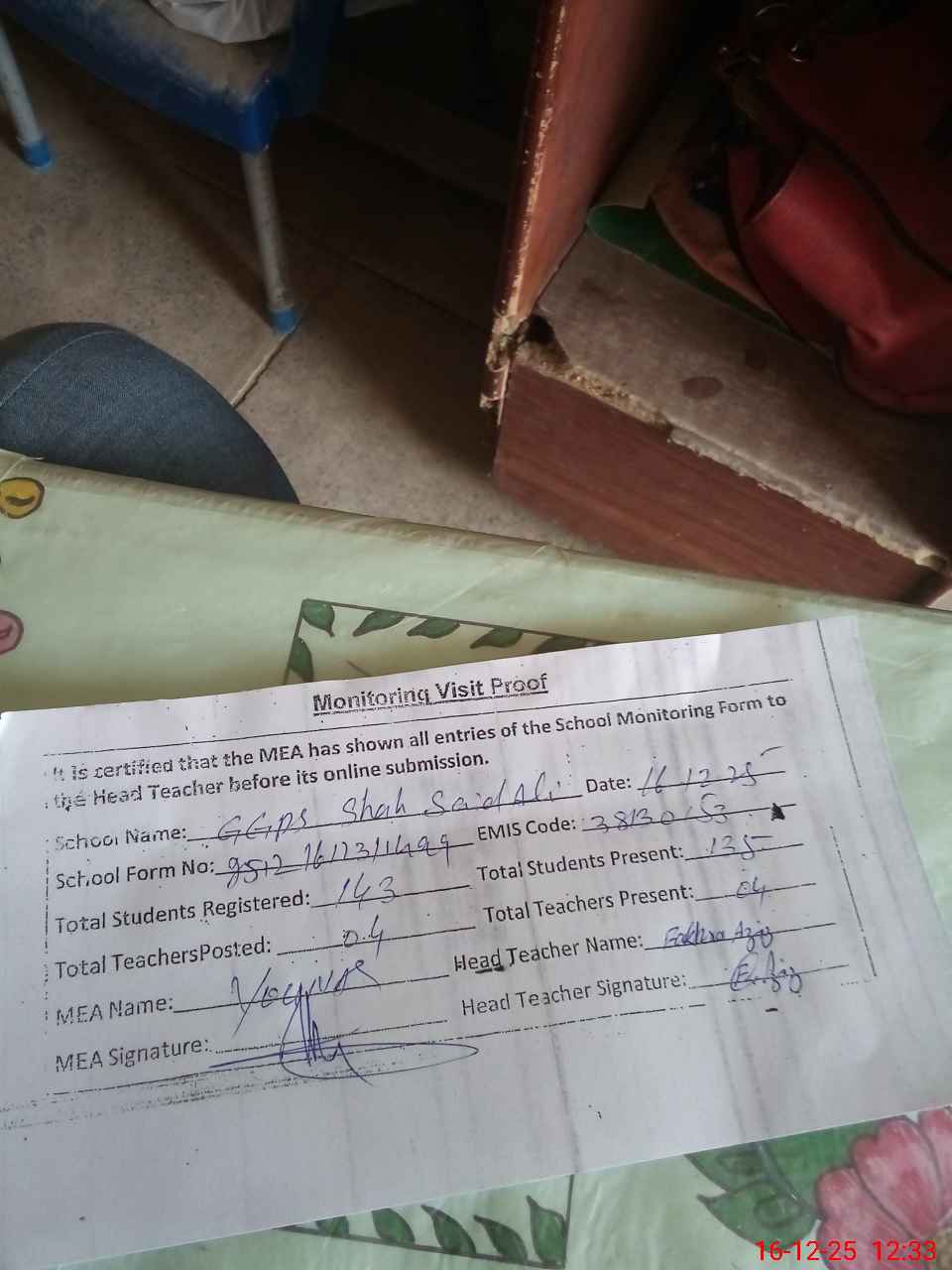 | Attendance Register | Head Teacher | MEA with School | Visit Proof |