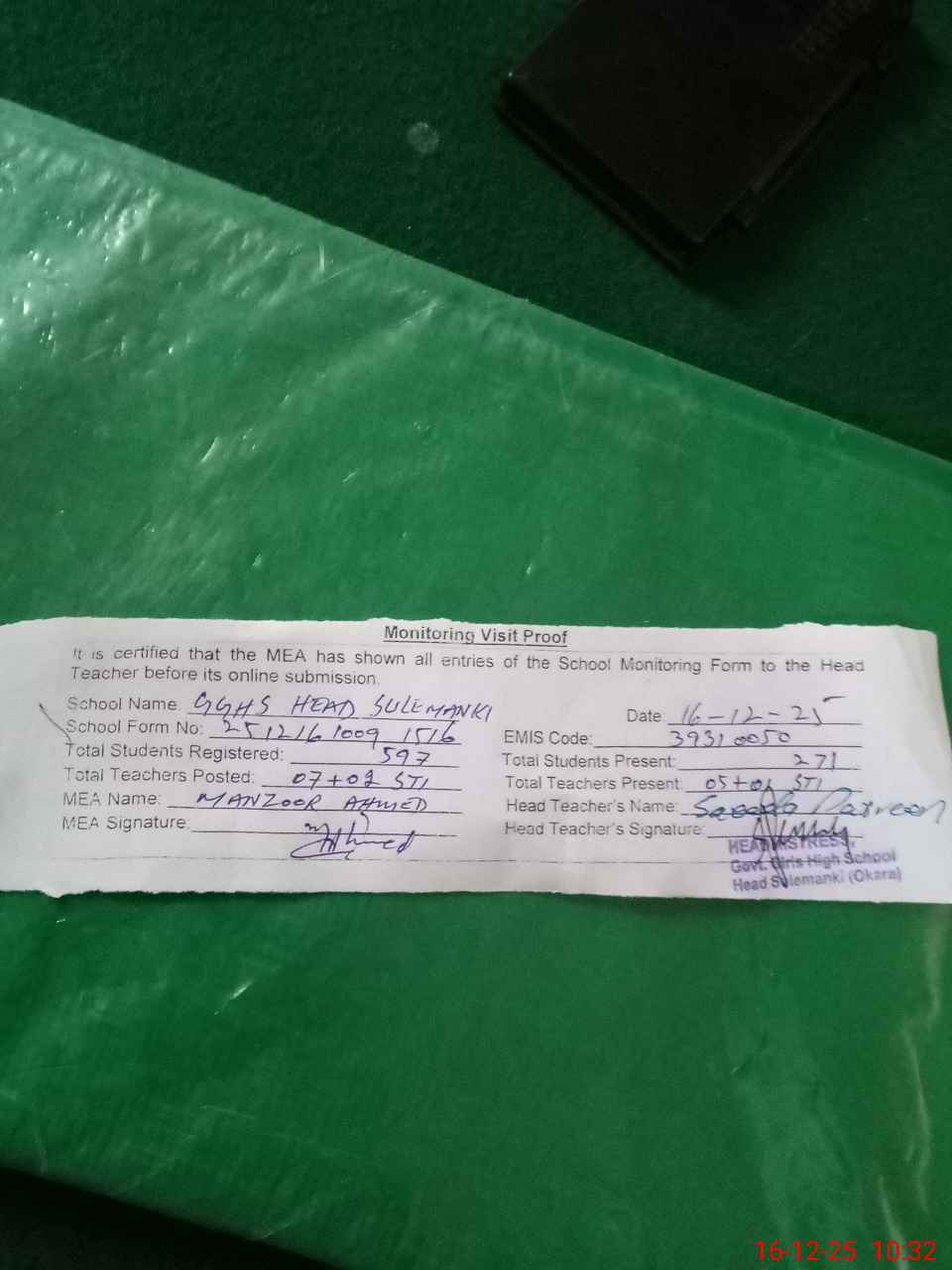 | EMIS Code: 39310050 | Name of School: GGHS HEAD SULEMANKI | |||