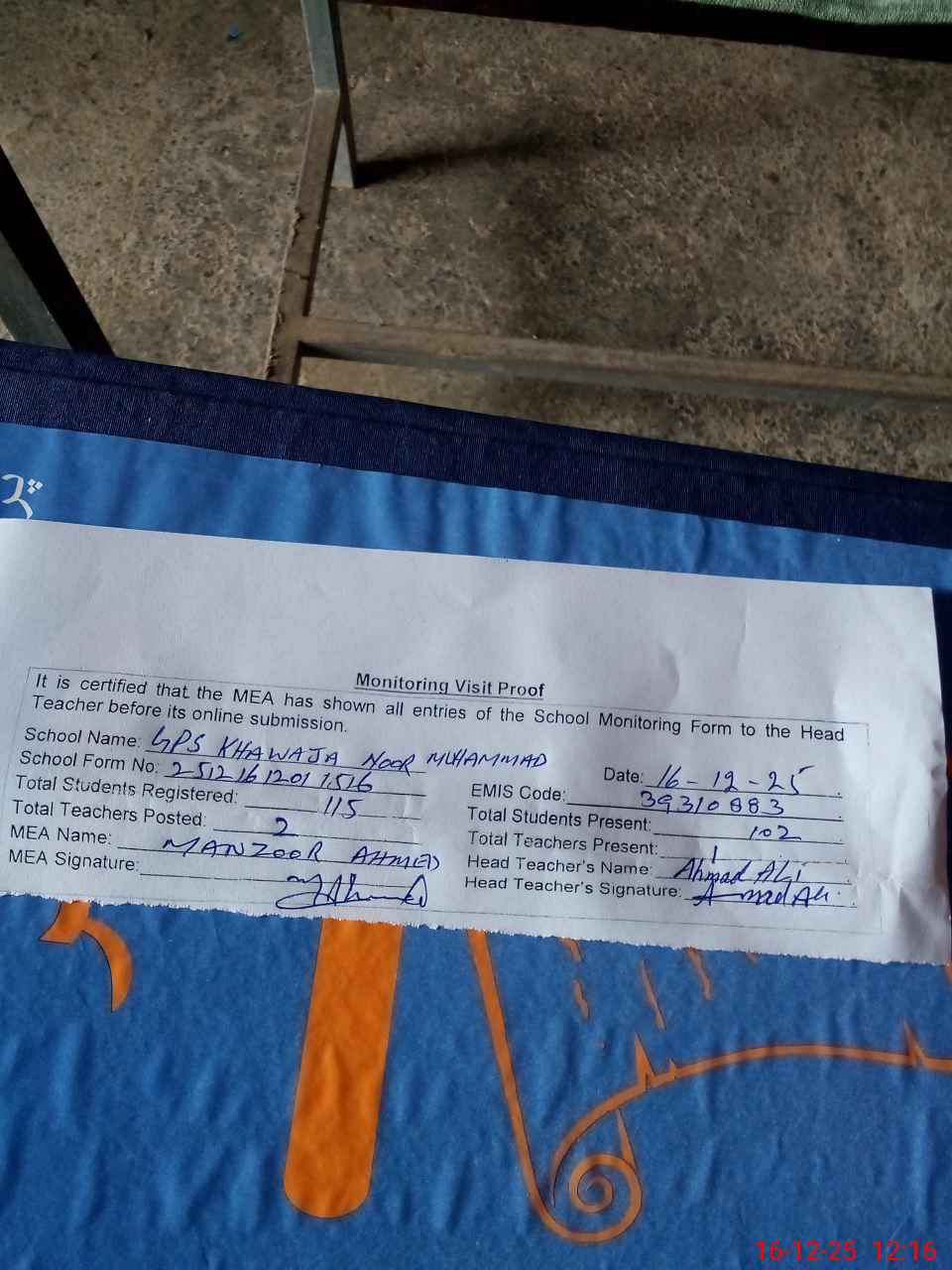 | EMIS Code: 39310883 | Name of School: GPS KHAWAJA NOOR MUHAMMAD | |||