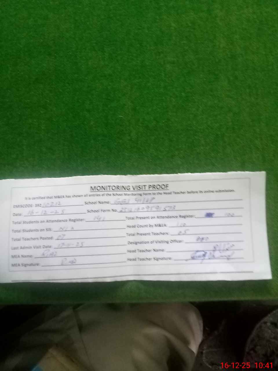 | Attendance Register | Head Teacher | MEA with School | Visit Proof |