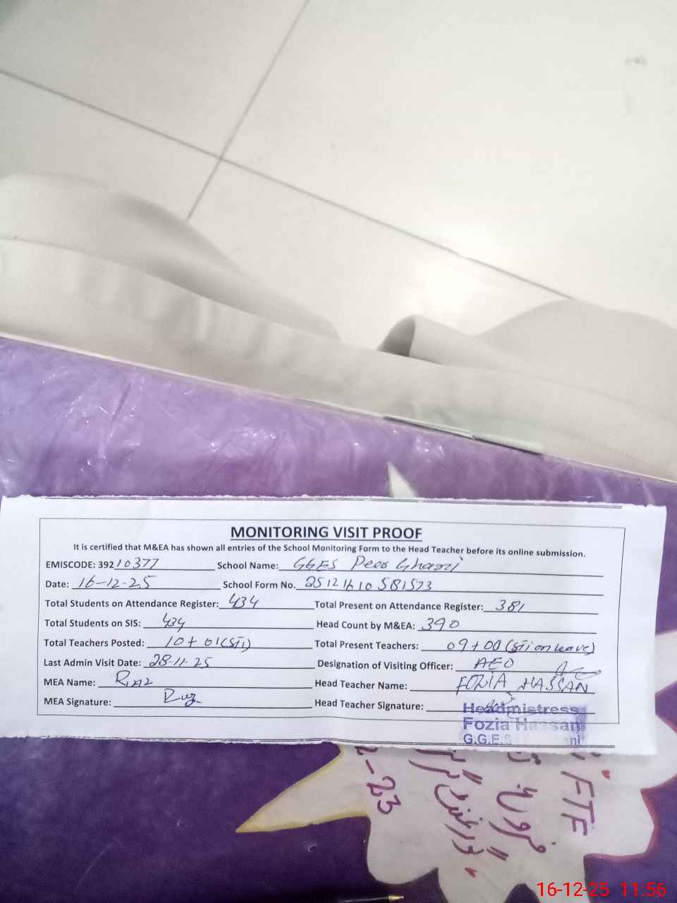 | Attendance Register | Head Teacher | MEA with School | Visit Proof |