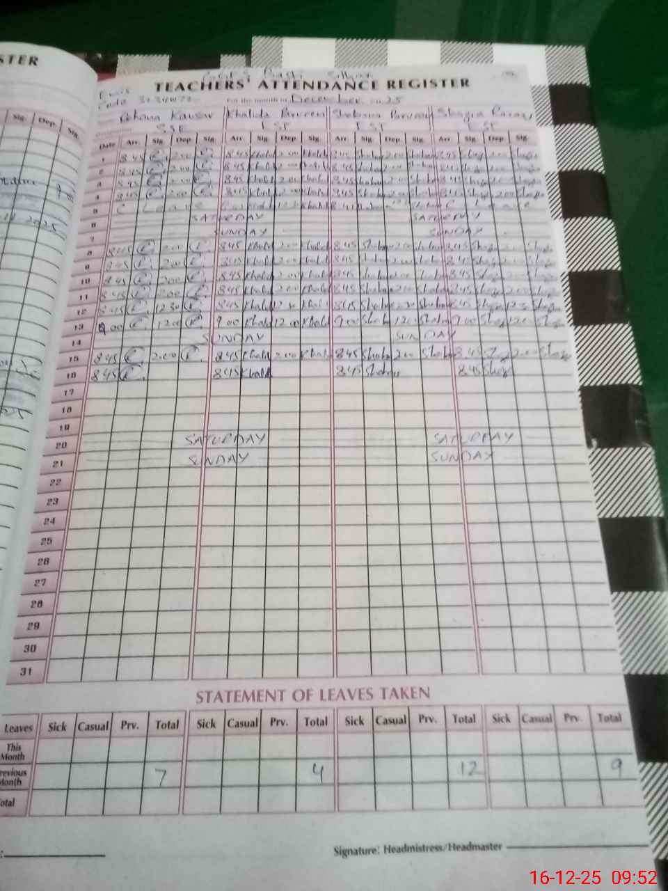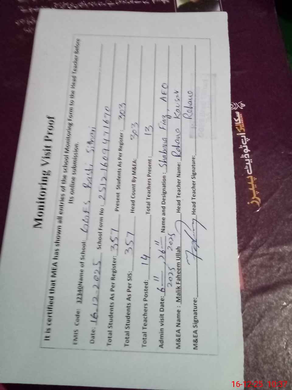 | Attendance Register | Head Teacher | MEA with School | Visit Proof |