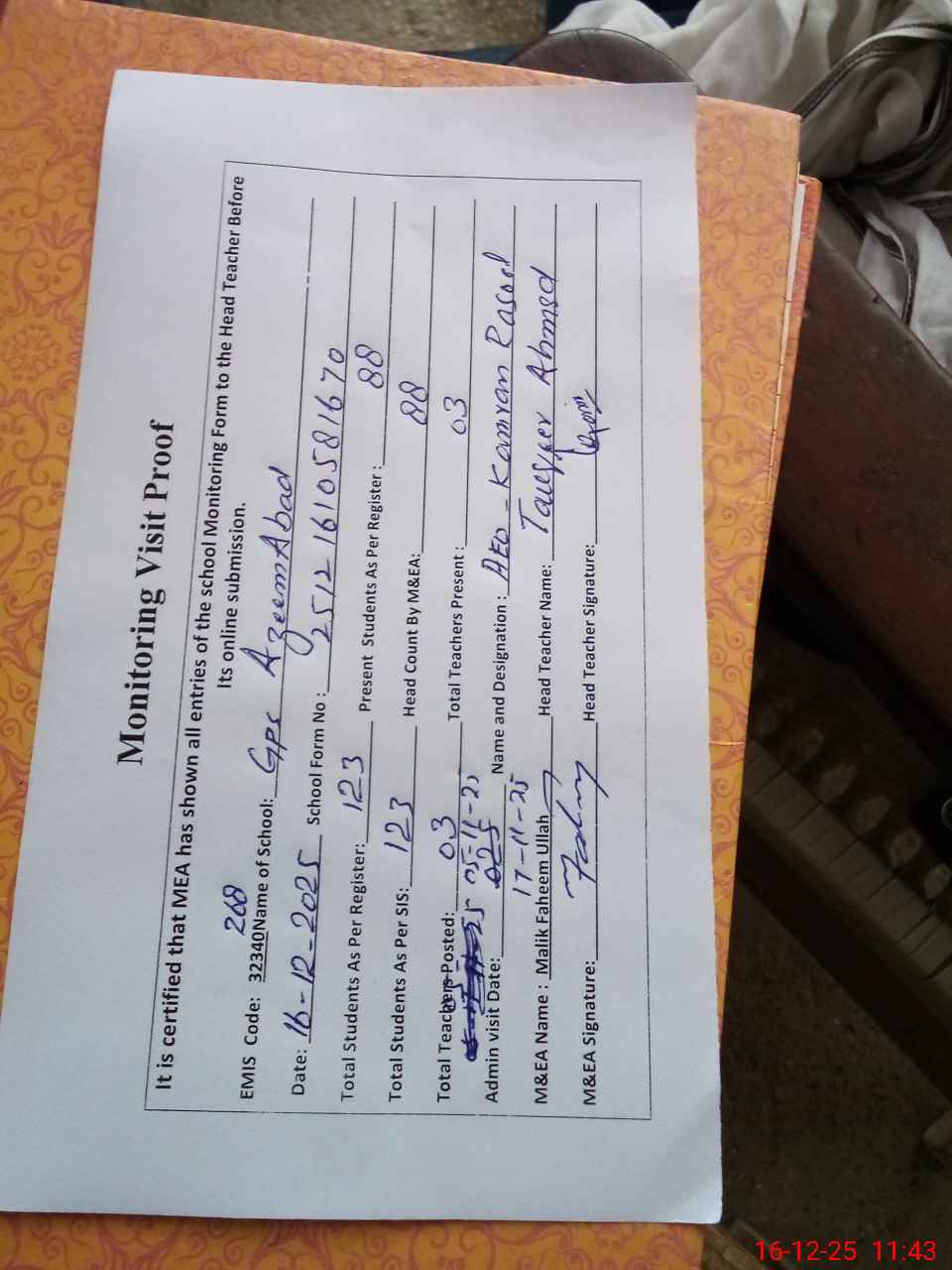 | Attendance Register | Head Teacher | MEA with School | Visit Proof |