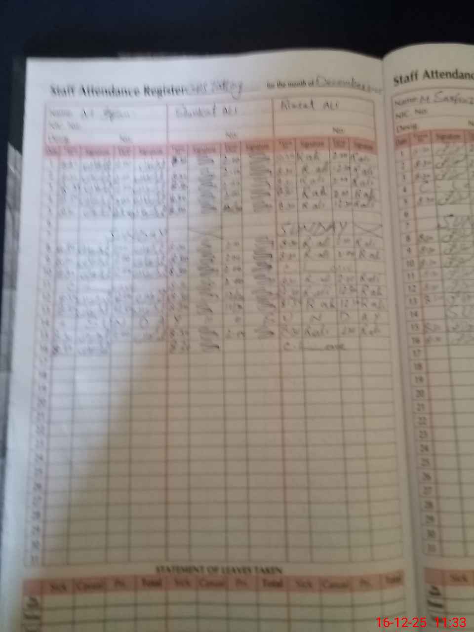 | CNIC | Full Name | Designation | R/C | Absence During Last Calender Month |