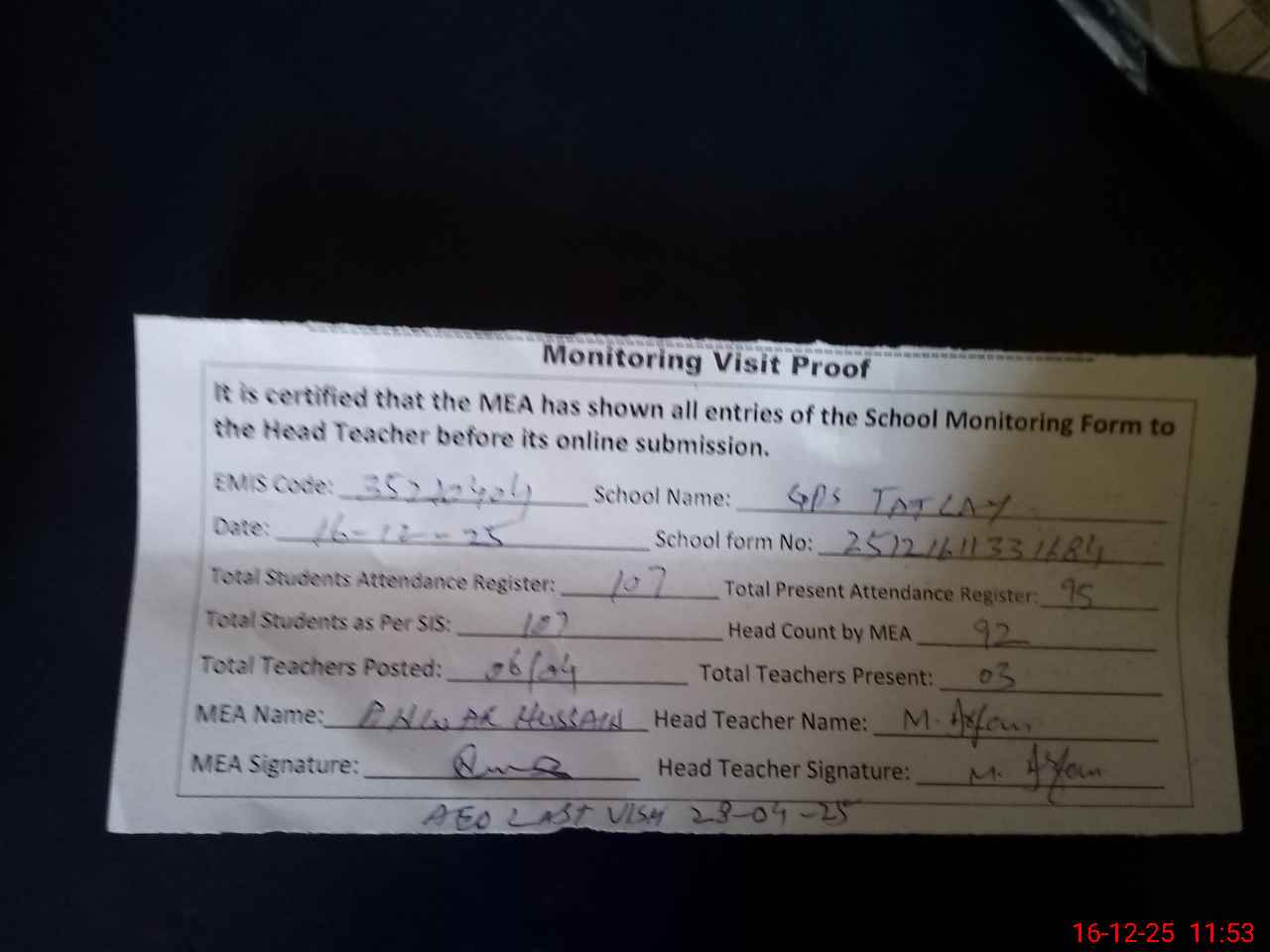 | Attendance Register | Head Teacher | MEA with School | Visit Proof |