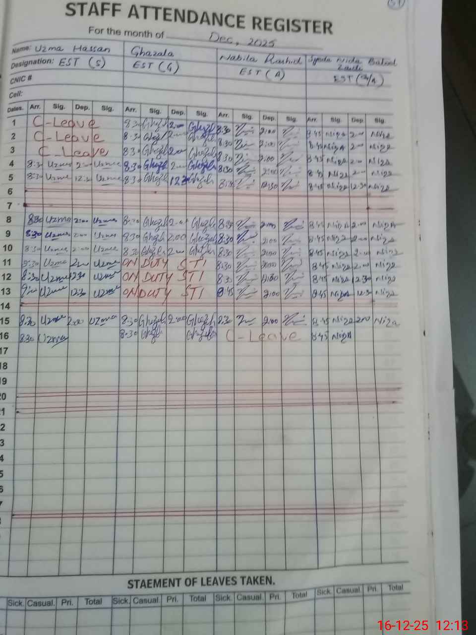 | CNIC | Full Name | Designation | R/C | Absence During Last Calender Month |